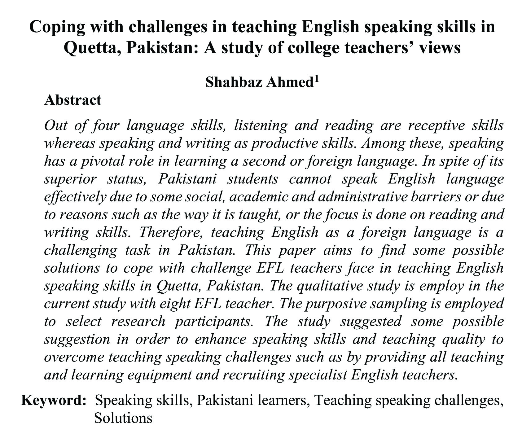 Coping with challenges in teaching English speaking skills in Quetta, Pakistan: A study of college teachers' views (abstract)