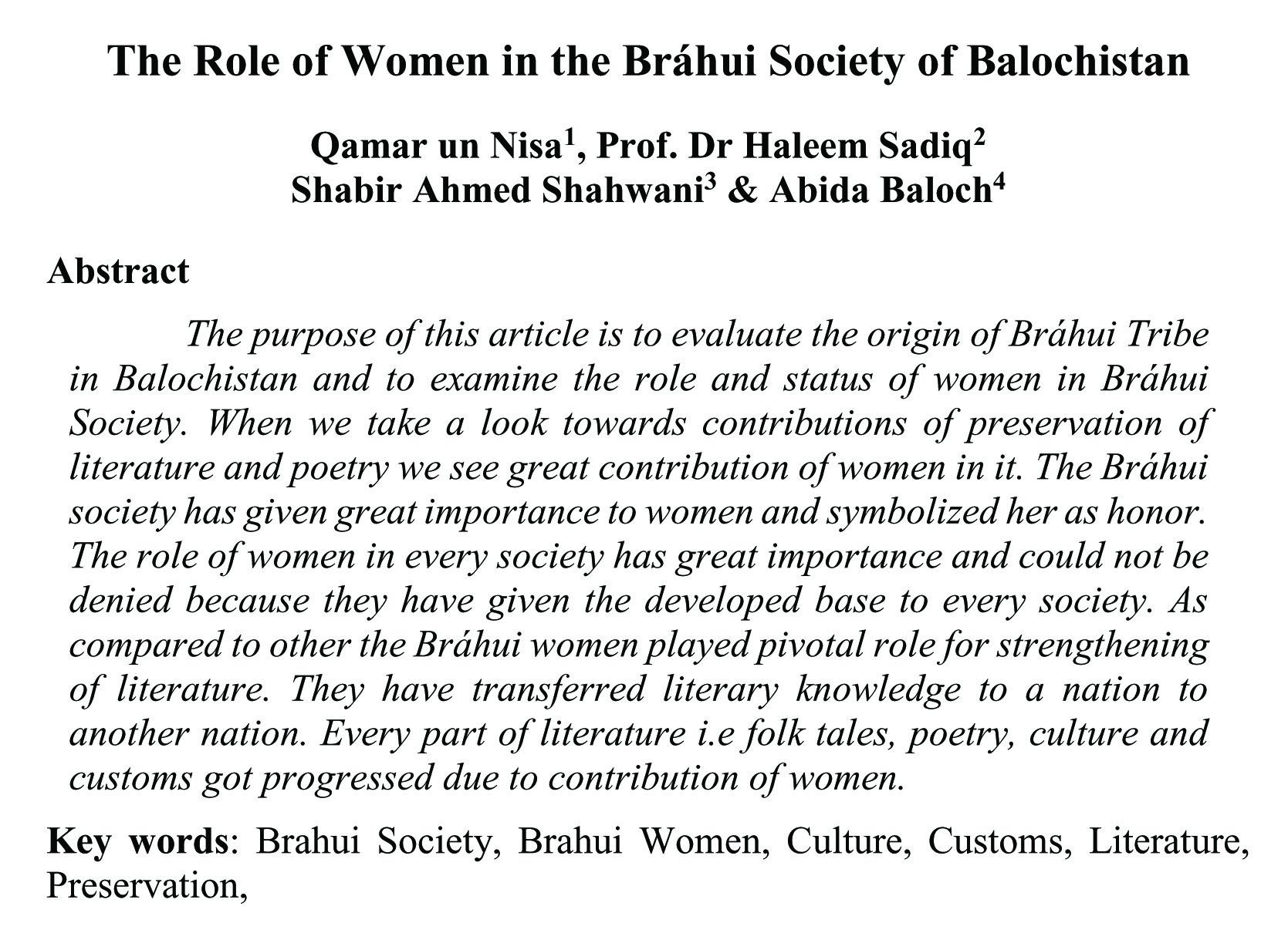 The Role of Women in the Brahui Society of Balochistan (abstract)