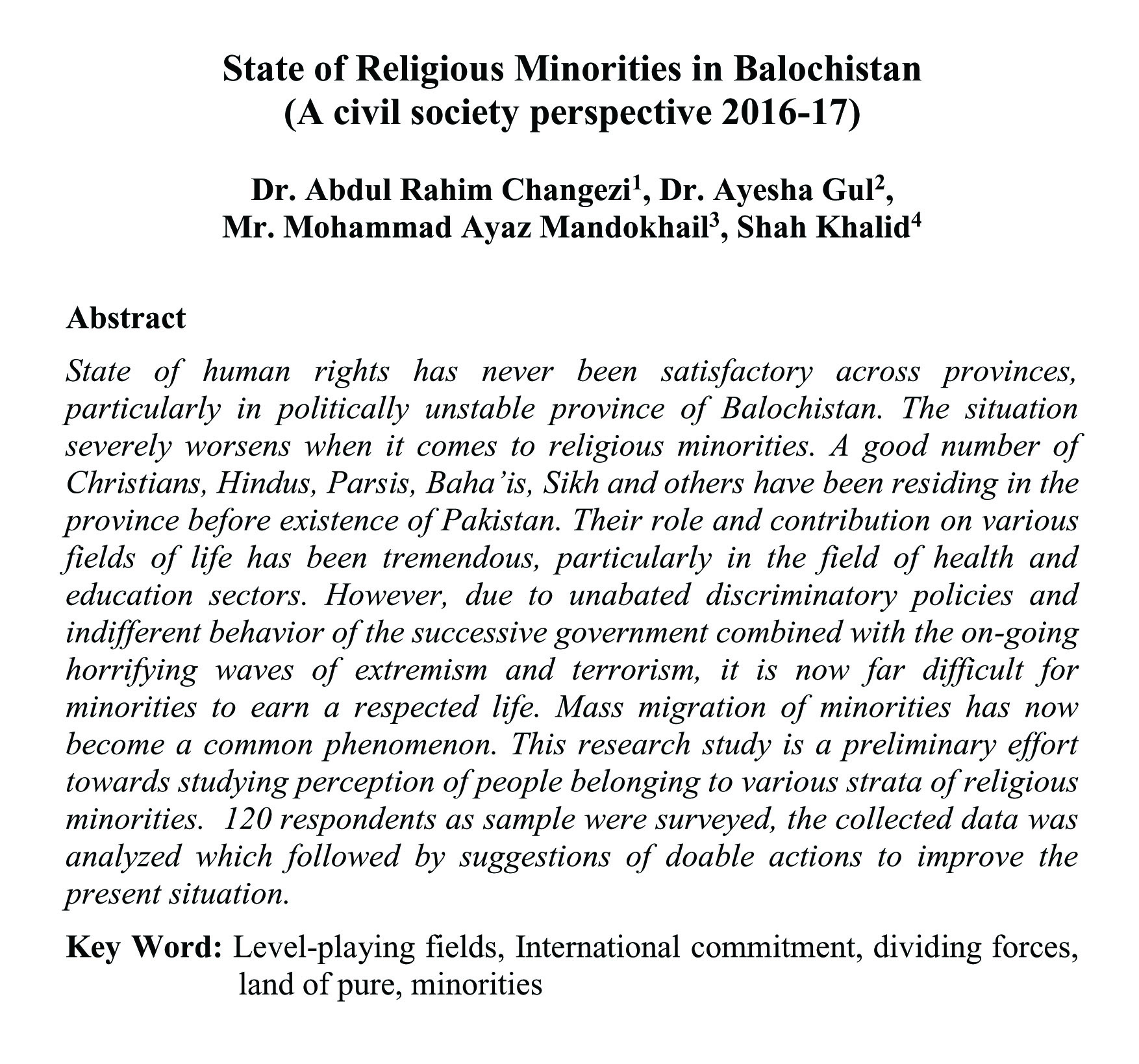 State of Religious Minorities in Balochistan (A civil society perspective 2016-17) (abstract)