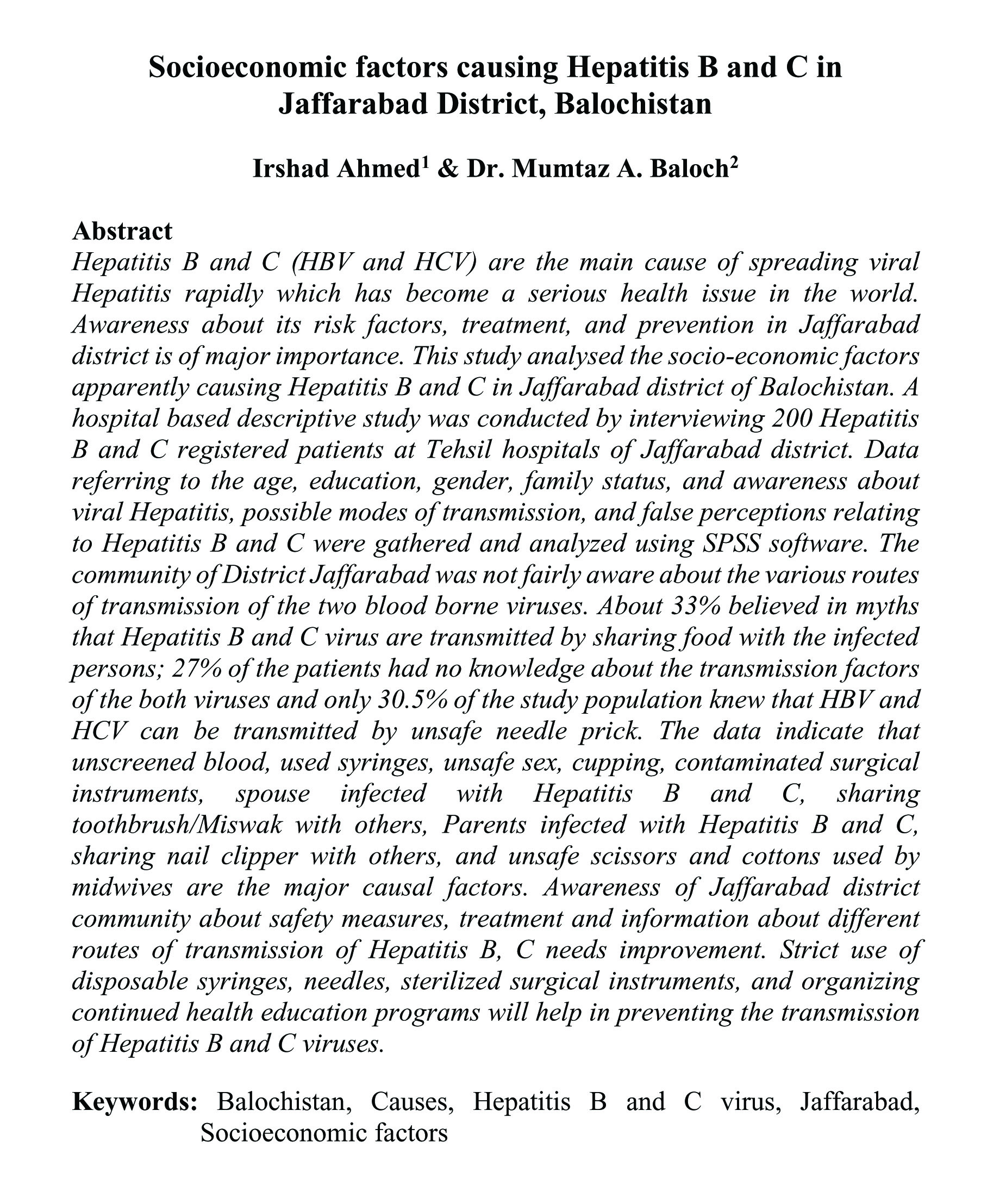 Socioeconomic factors causing Hepatitis B and C in Jaffarabad District, Balochistan (abstract)