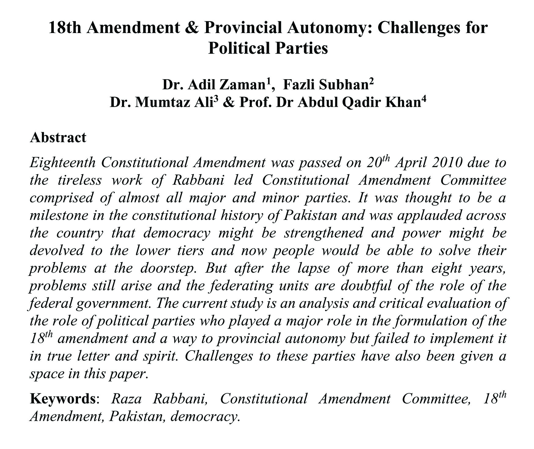 18th Amendment & Provincial Autonomy: Challenges for Political Parties (abstract)