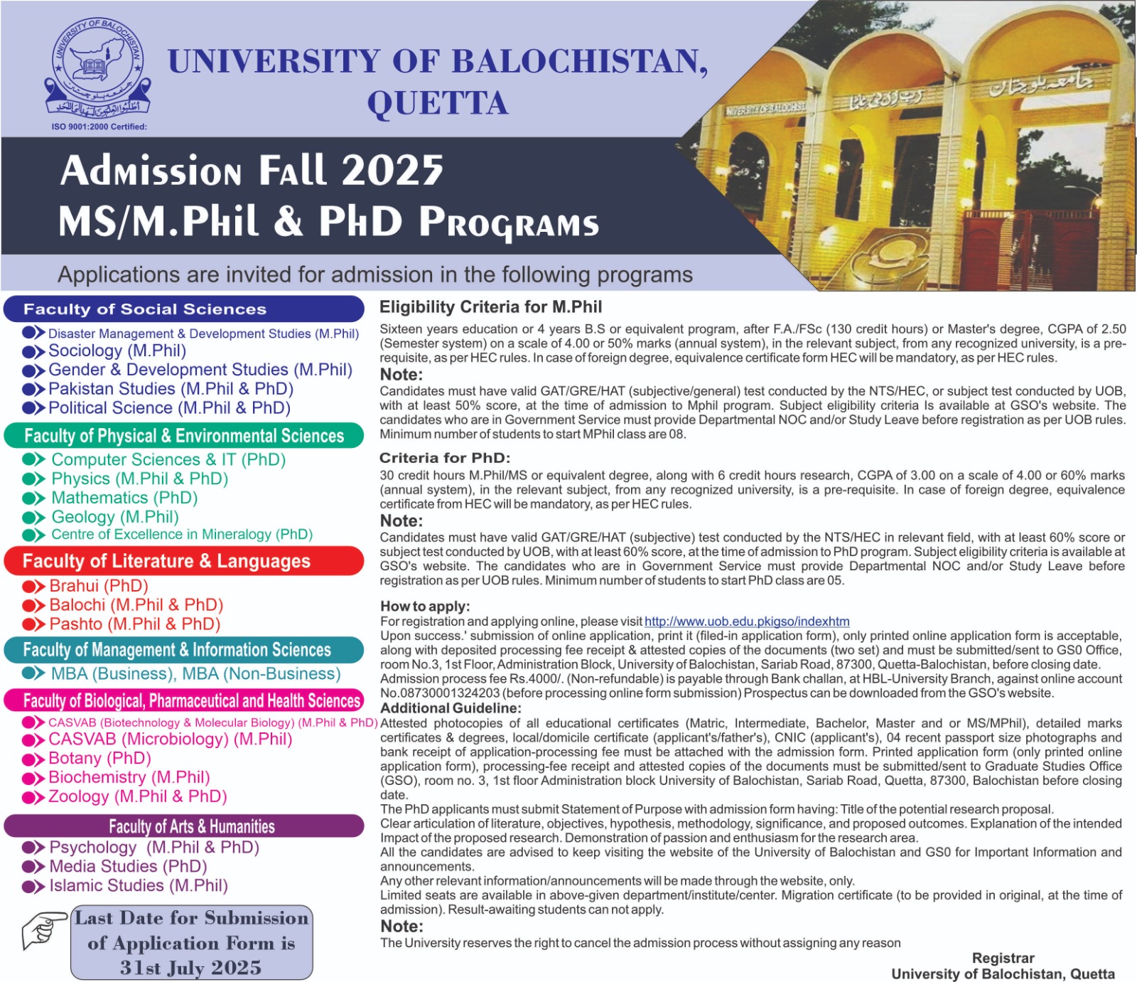 The students applying for admission in Sub Campus Mastung and Pishin are