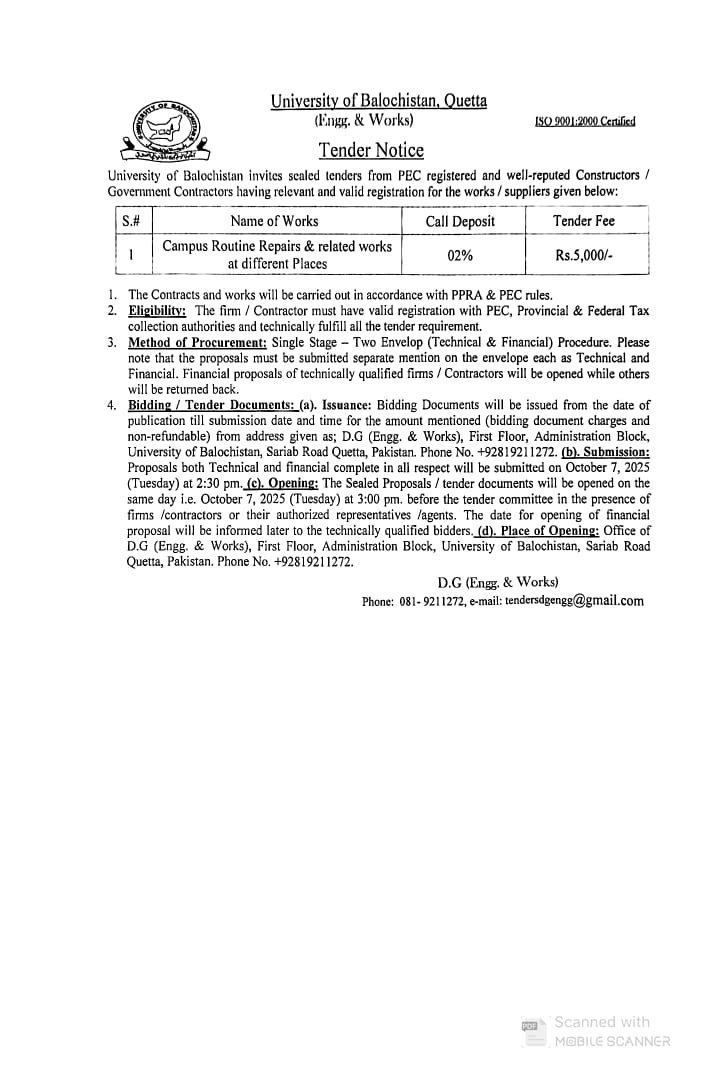Tender Notice: Miscellaneous Repairs, Renovations & Maintenance Works in the Campus, University of Balochistan.