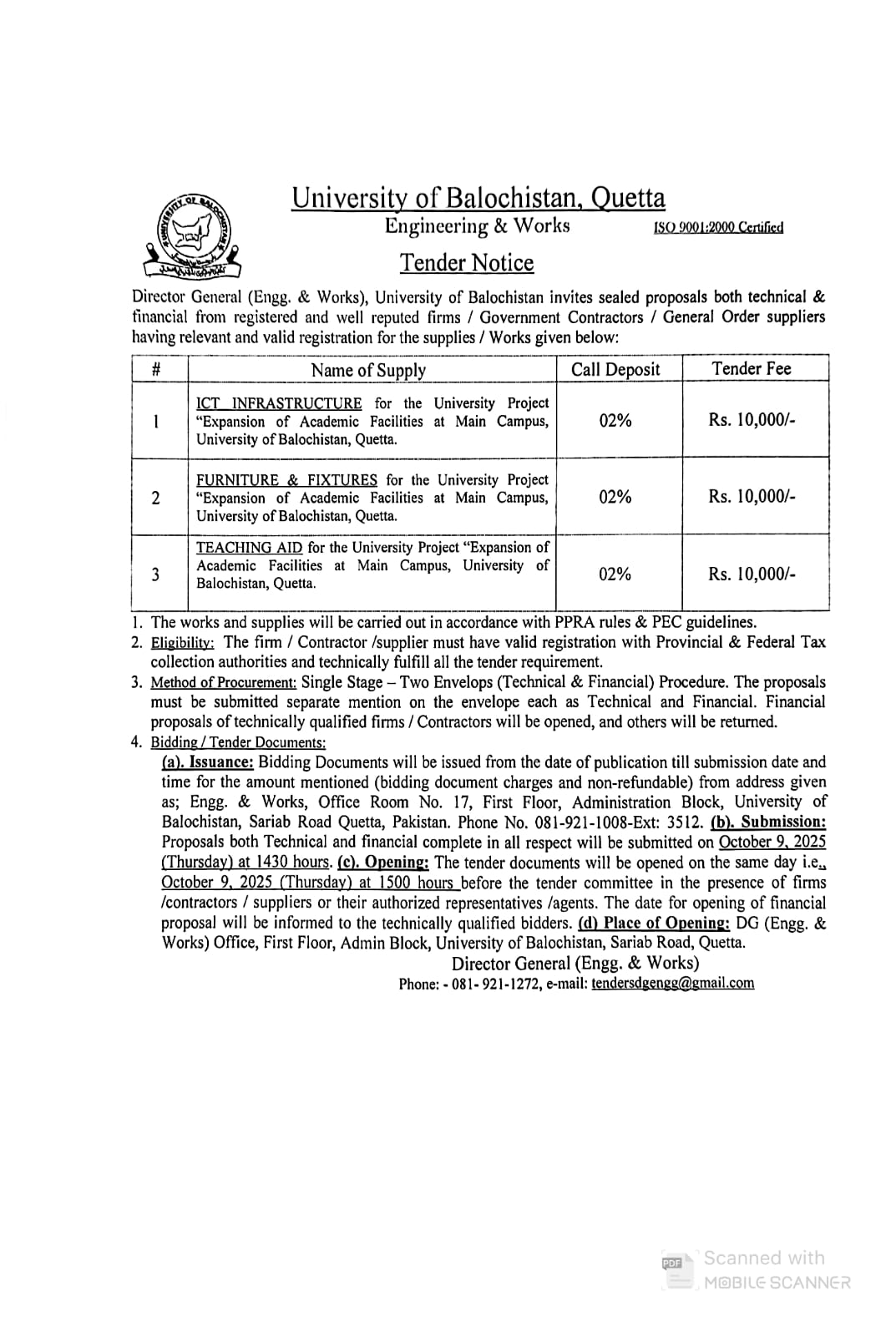 Tender Notice Supply of Teaching aid Equipments (for sub campuses Kharan & Mastung) , Hybrid PABX Exchange & ICT equipments (for JB Campus) University of Balochistan
