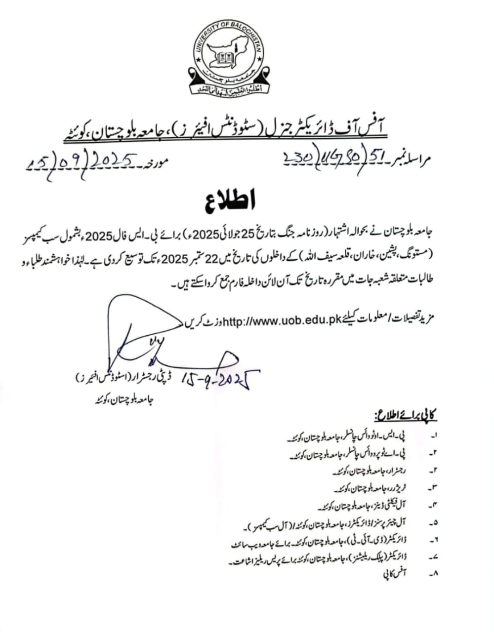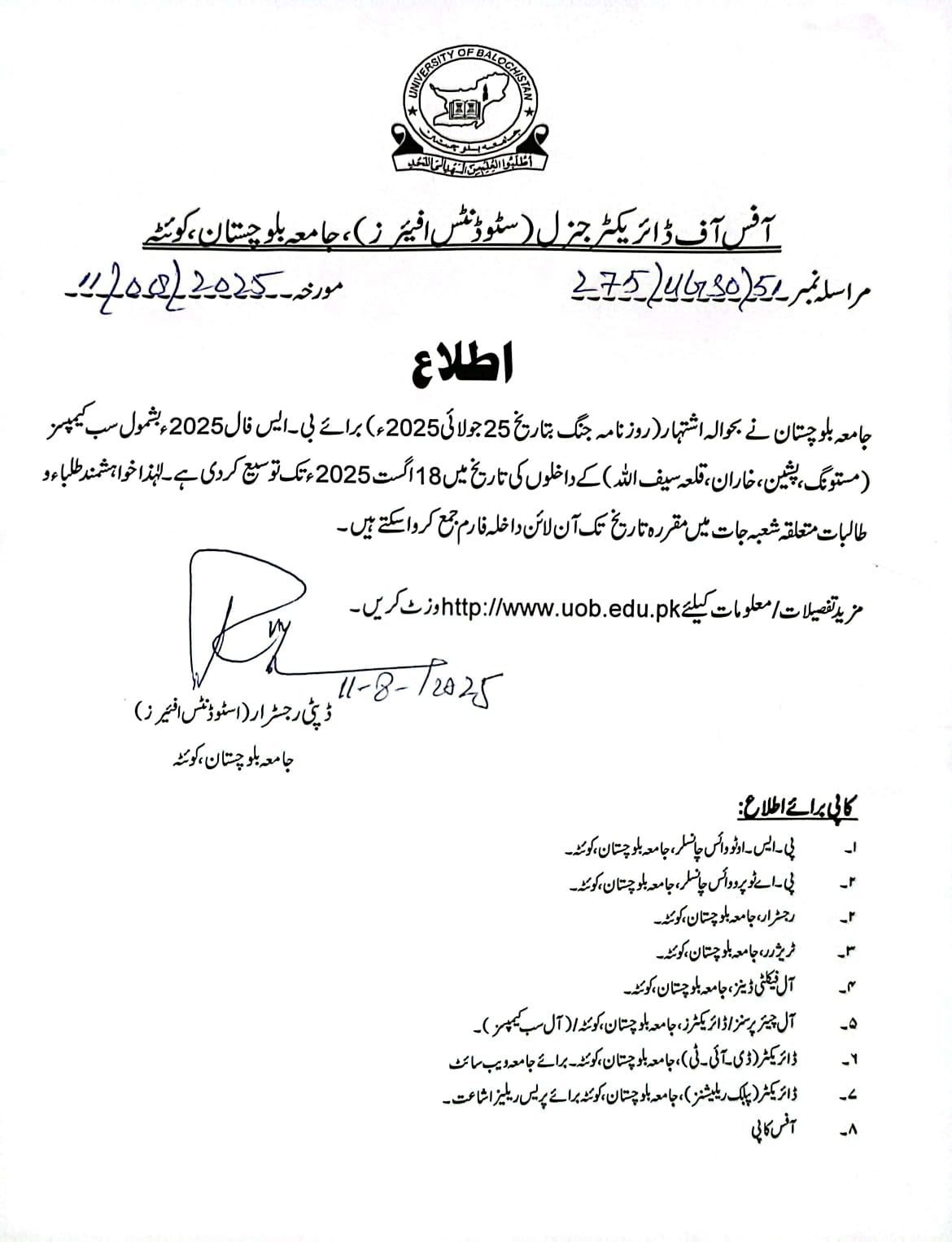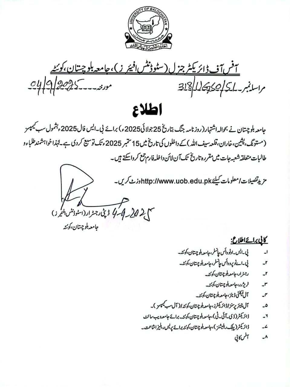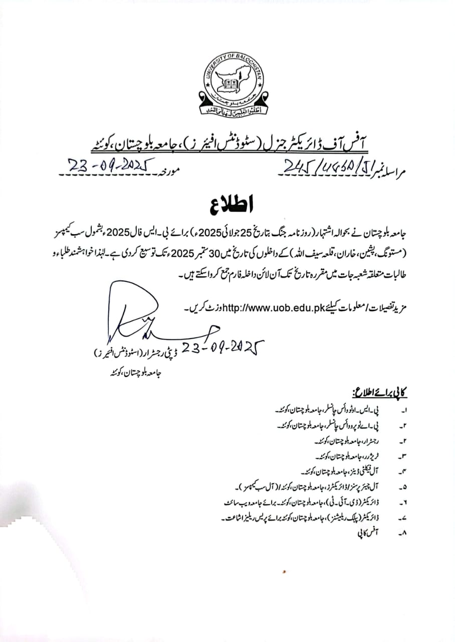 The students applying for admission in Sub Campus Mastung and Pishin are