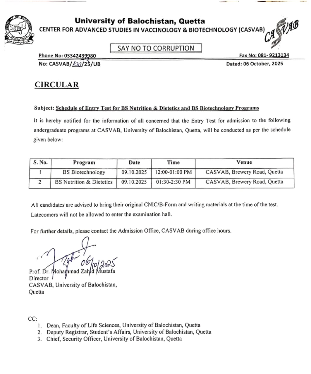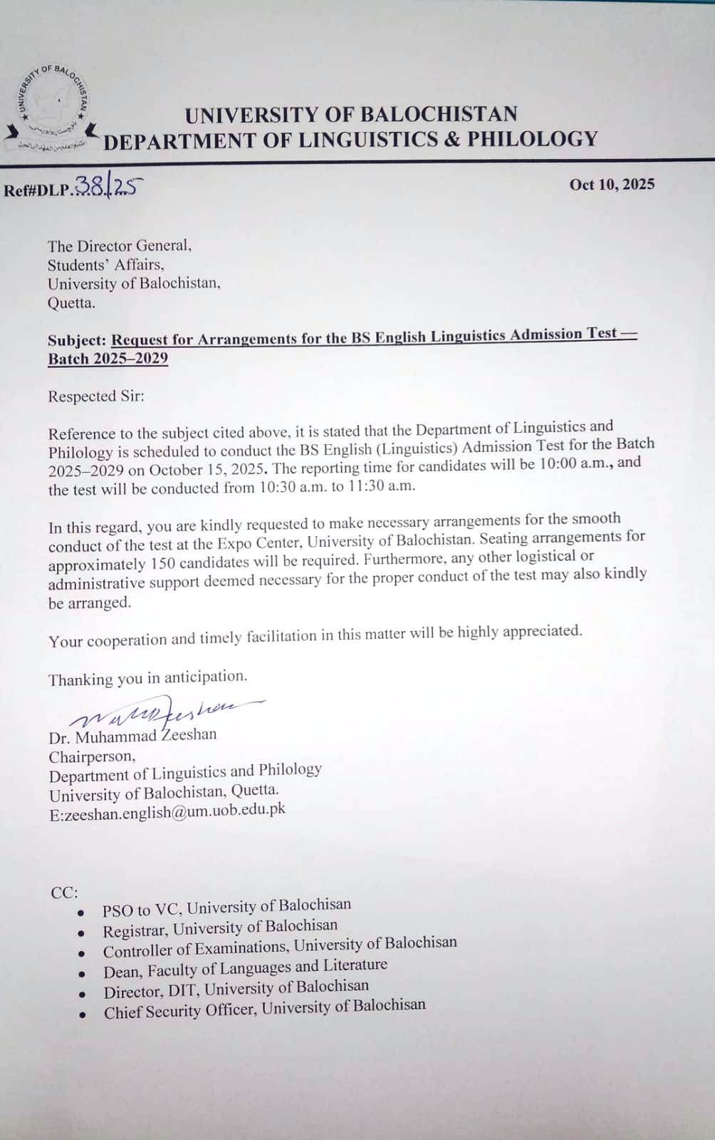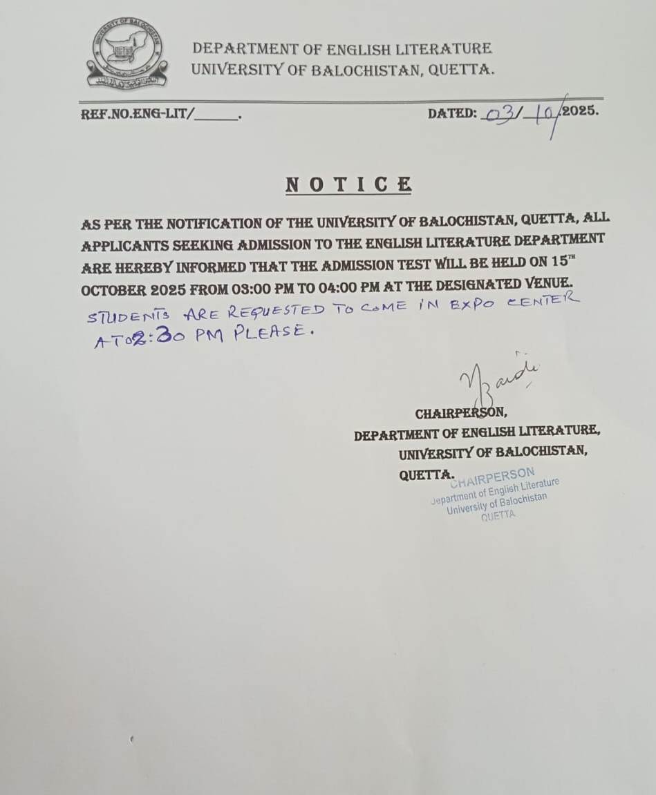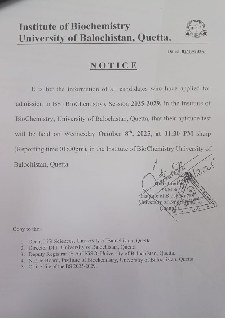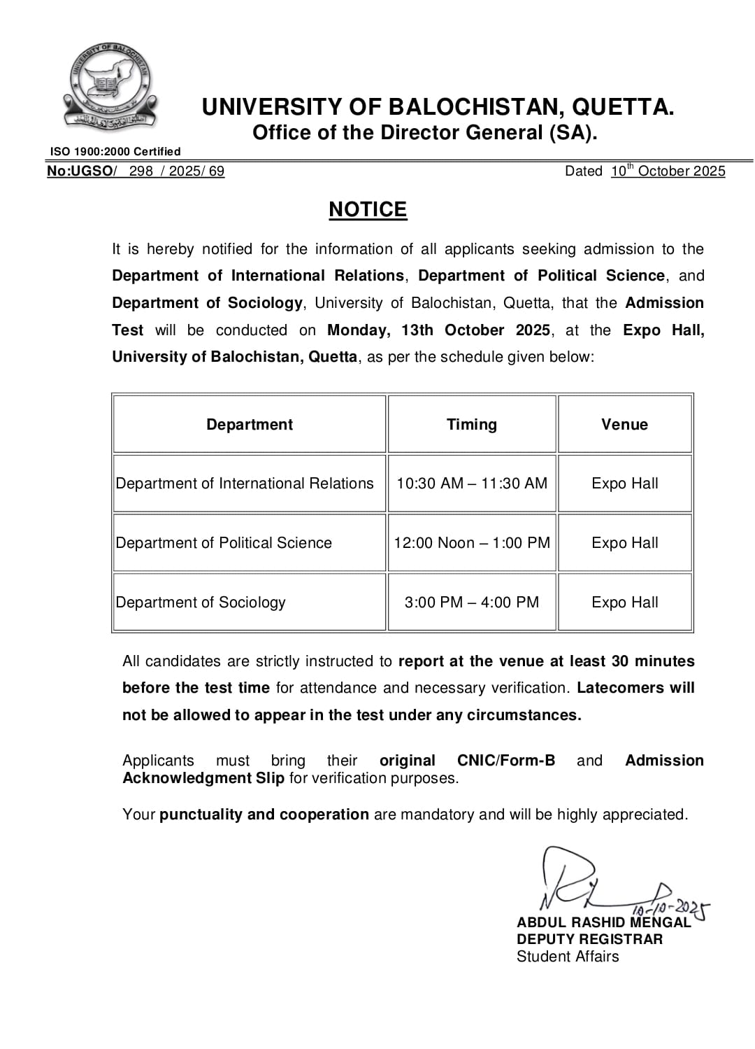 The students applying for admission in Sub Campus Mastung and Pishin are
