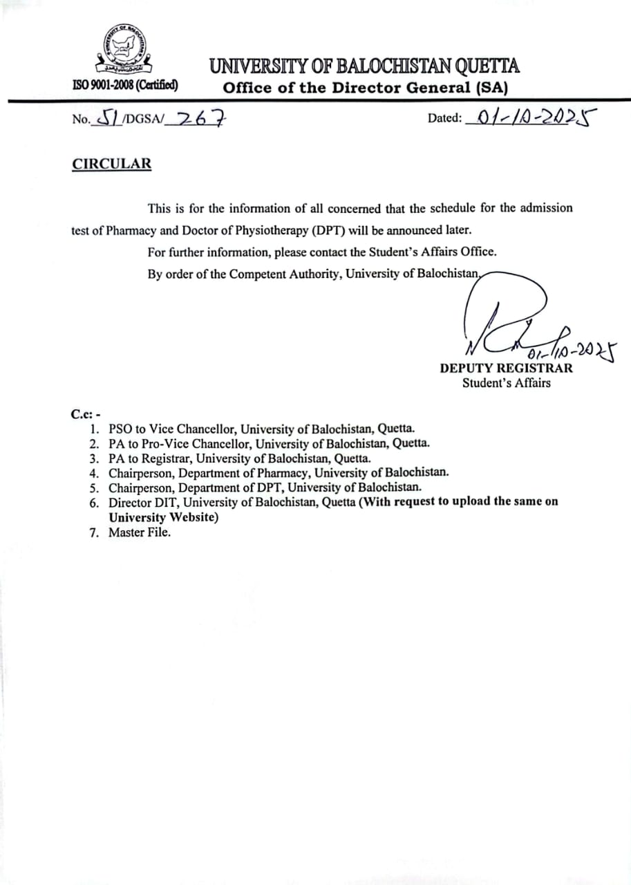 of Pharmacy (Main campus), Mastung Campus, Pishin Campus and Doctor of Physical