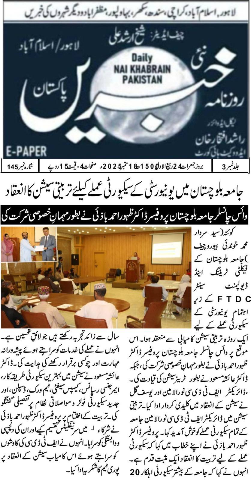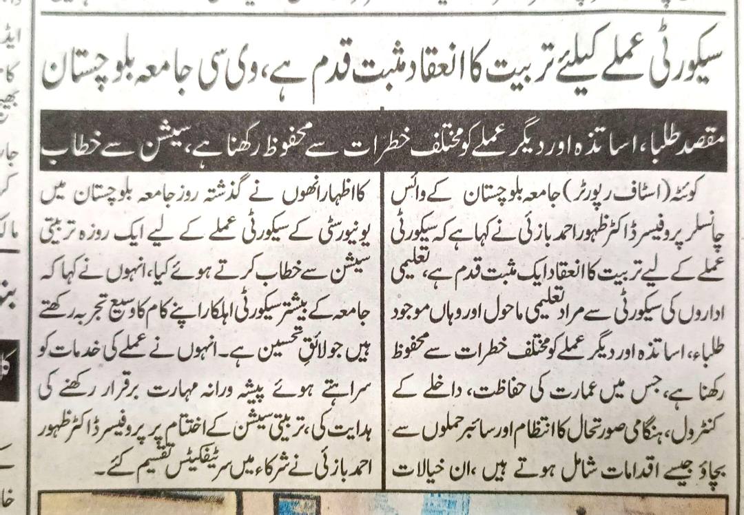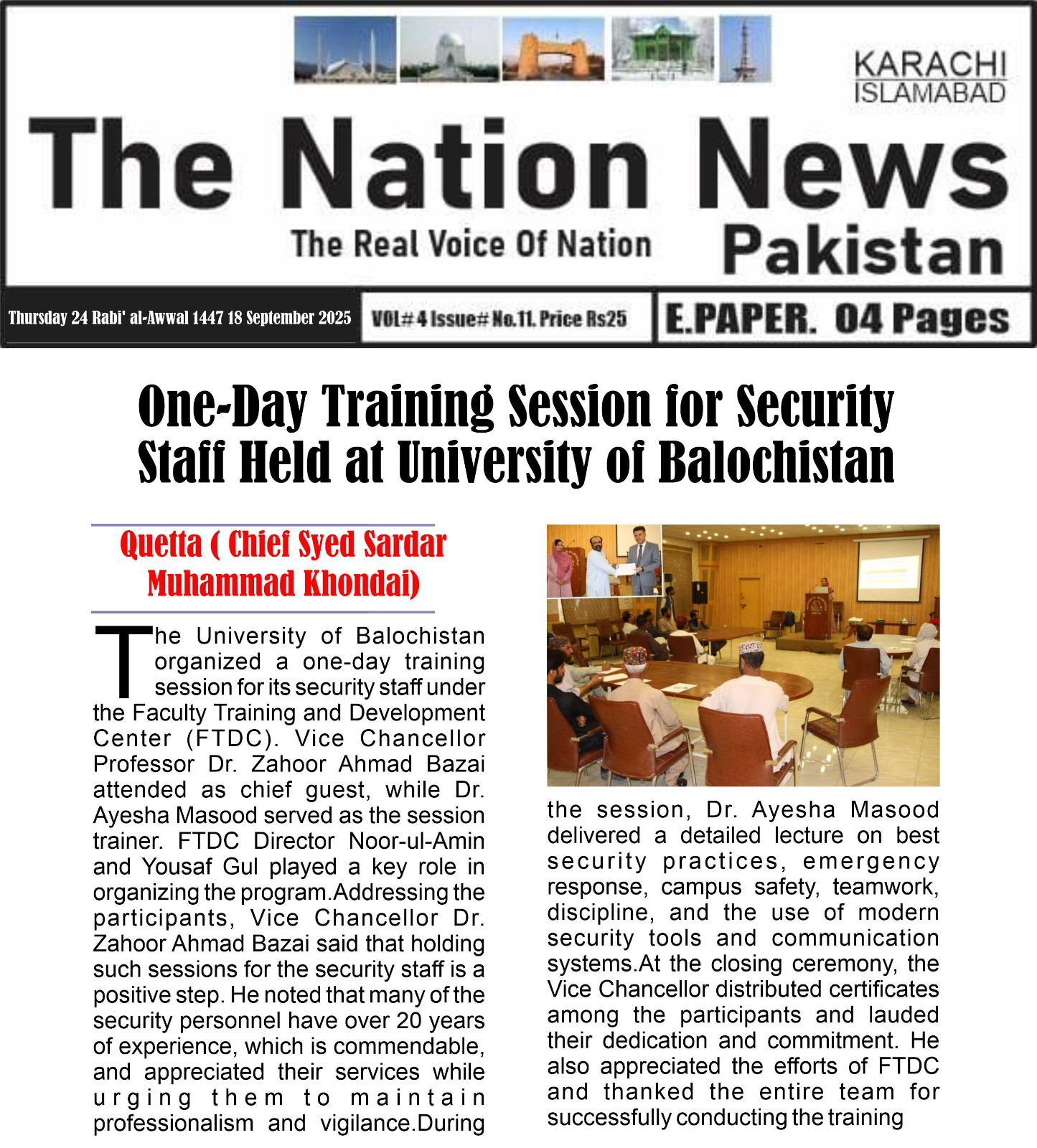 A one-day training session was organized for the university's security staff at the University of Balochistan.
