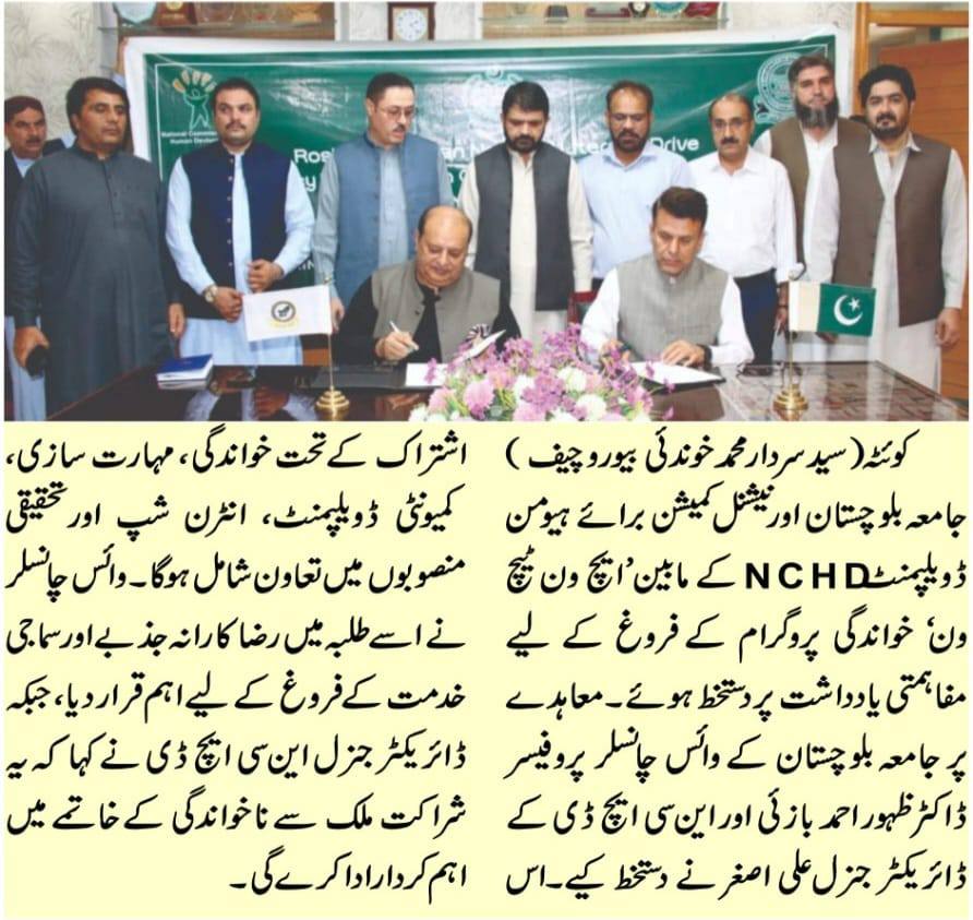 Memorandum of Understanding signed between University of Balochistan and NCHD for ‘H1 Teach1’ program