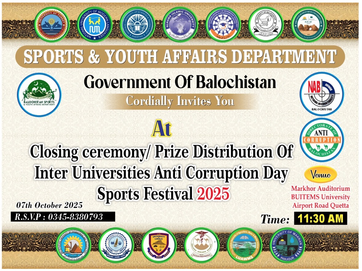 The Inter-University Anti-Corruption Day Sports Festival competitions organized by the Balochistan Sports Department. University of Balochistan wins the final of the Inter-University Basketball Tournament