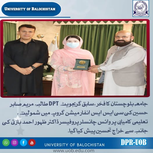 The pride of the University of Balochistan, former graduate student of the Department of DPT, Maryam Sabir Hussain, was felicitated by the Vice Chancellor, Professor Dr. Zahoor Ahmed Bazai, for her academic success in joining the CSS Information Group. DPR University of Balochistan 26 June 2025