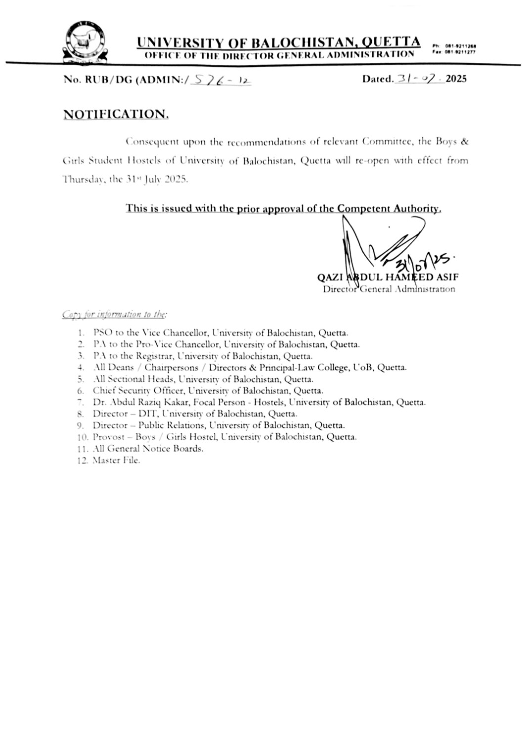 NOTIFICATION. Consequent upon the recommendations of relevant Committee, the Boys & Girls Student Hostels of University of Balochistan, Quetta will re-open with effect from Thursday, the 31 July 2025. This is issued with the prior approval of the Competent Authority,