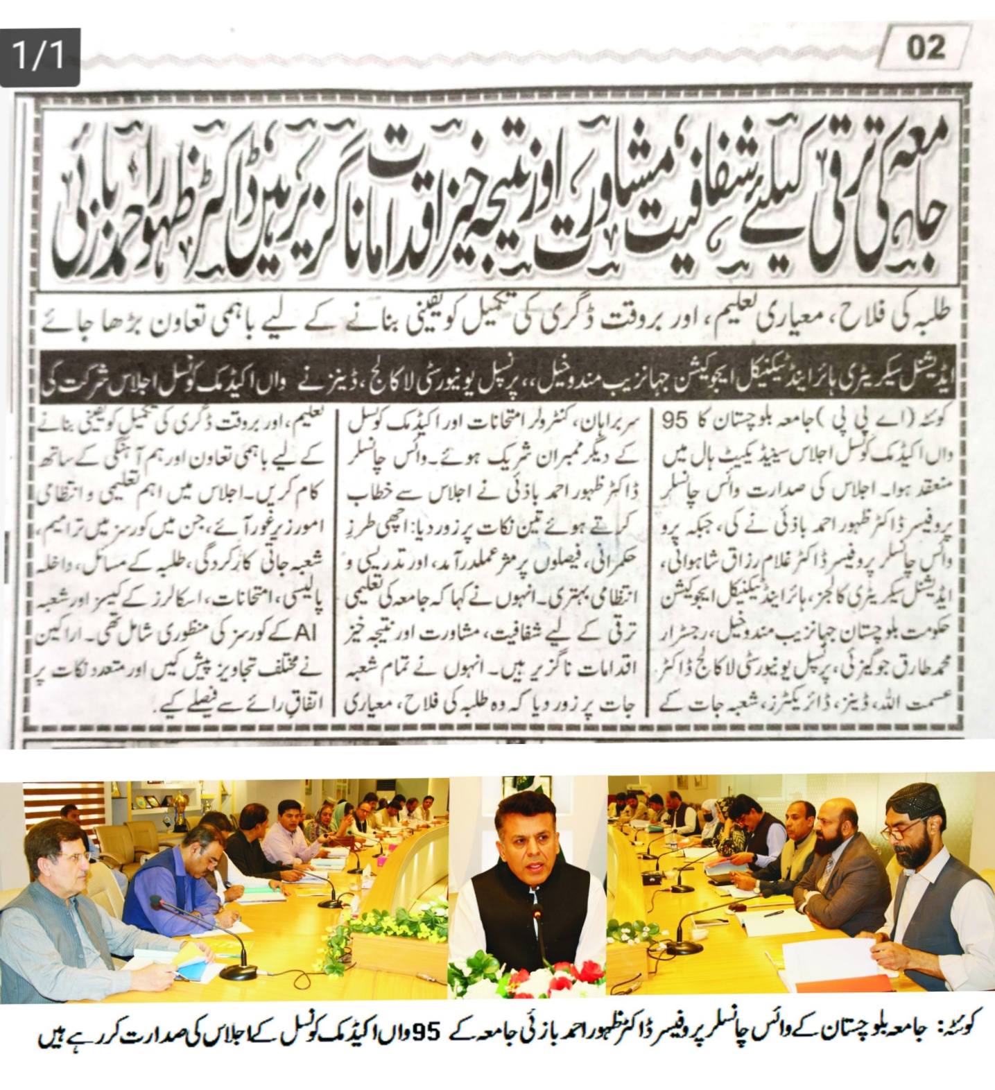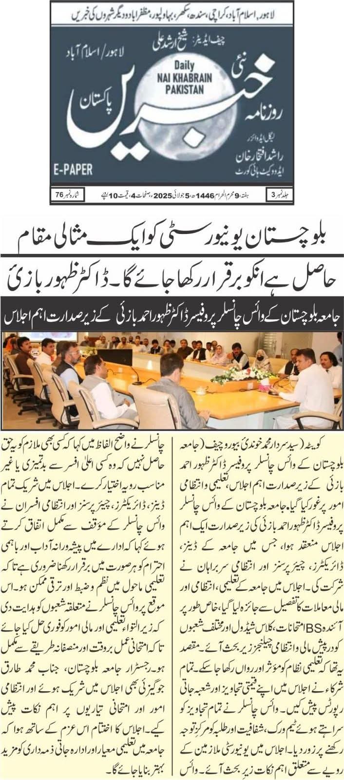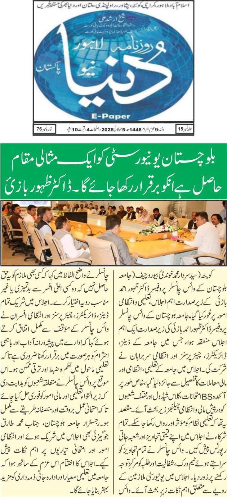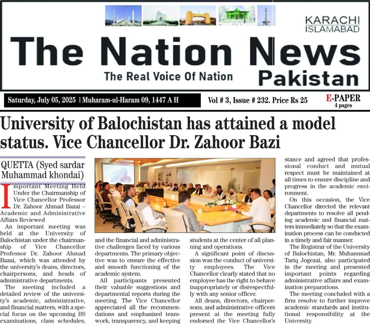 An important meeting was held under the chairmanship of the Vice Chancellor of the University of Balochistan, Professor Dr. Zahoor Ahmed Bazai, to discuss academic and administrative matters University of Balochistan DPR July 4, 2025