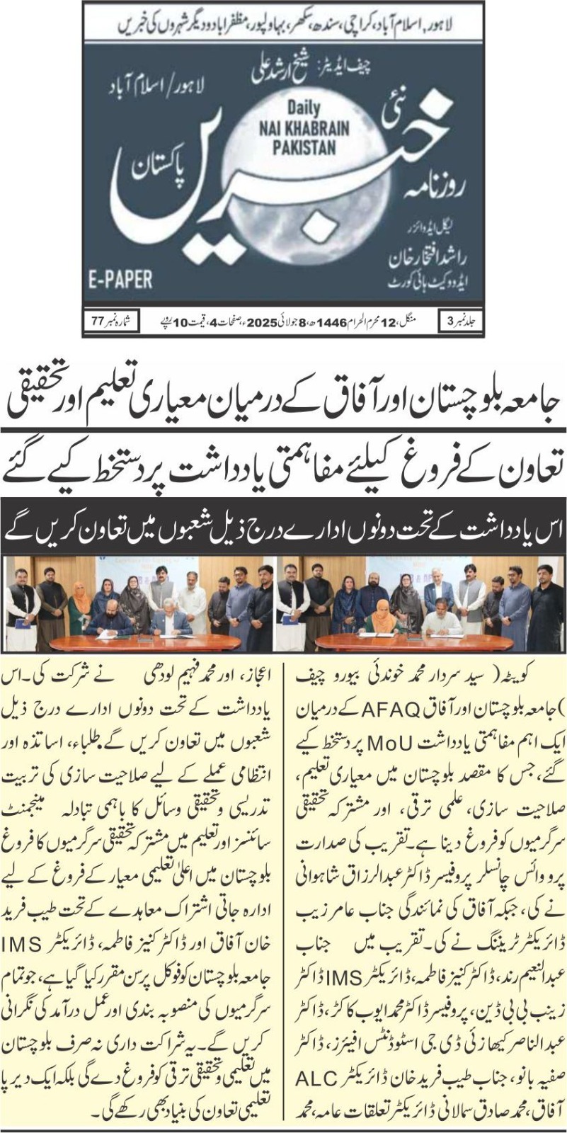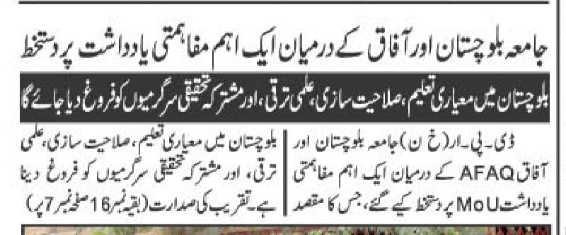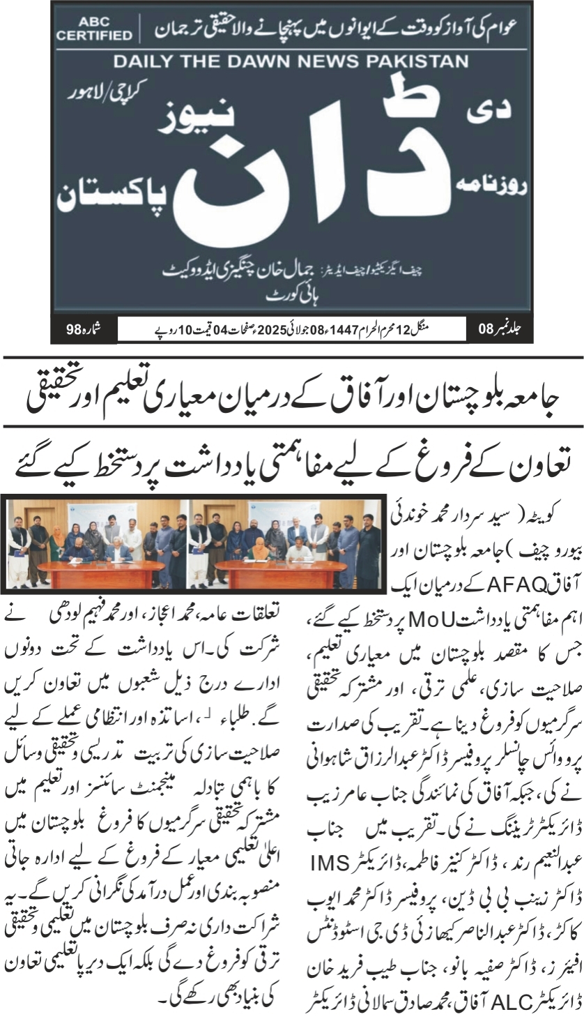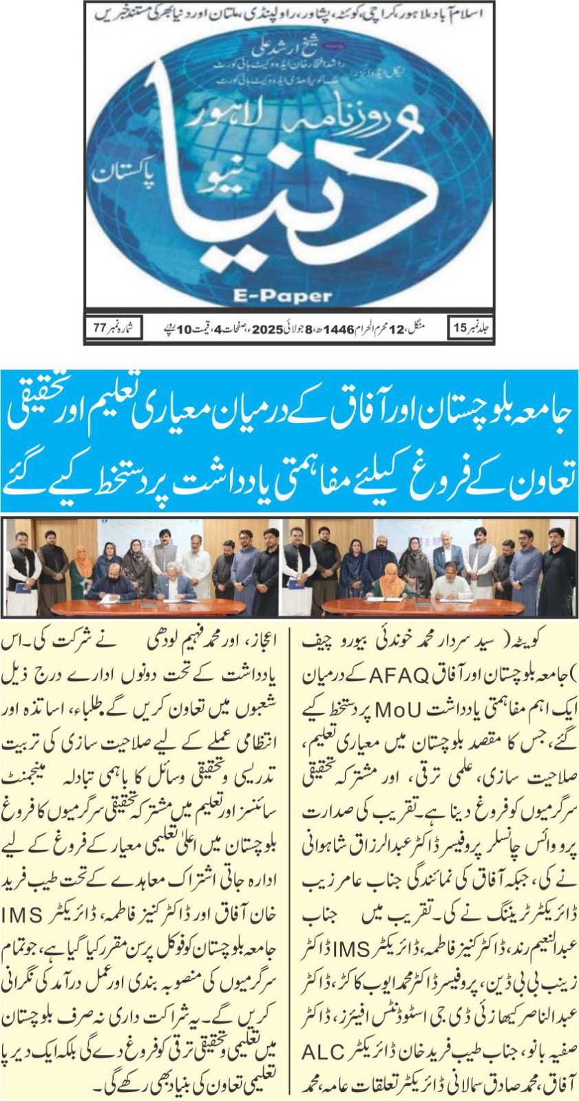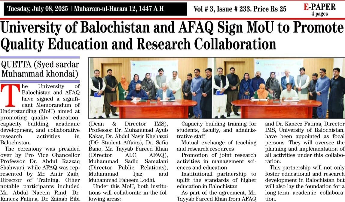 Memorandum of Understanding signed between University of Balochistan and Afaq to promote quality education and research cooperation DPR 07 July 2025 University of Balochistan