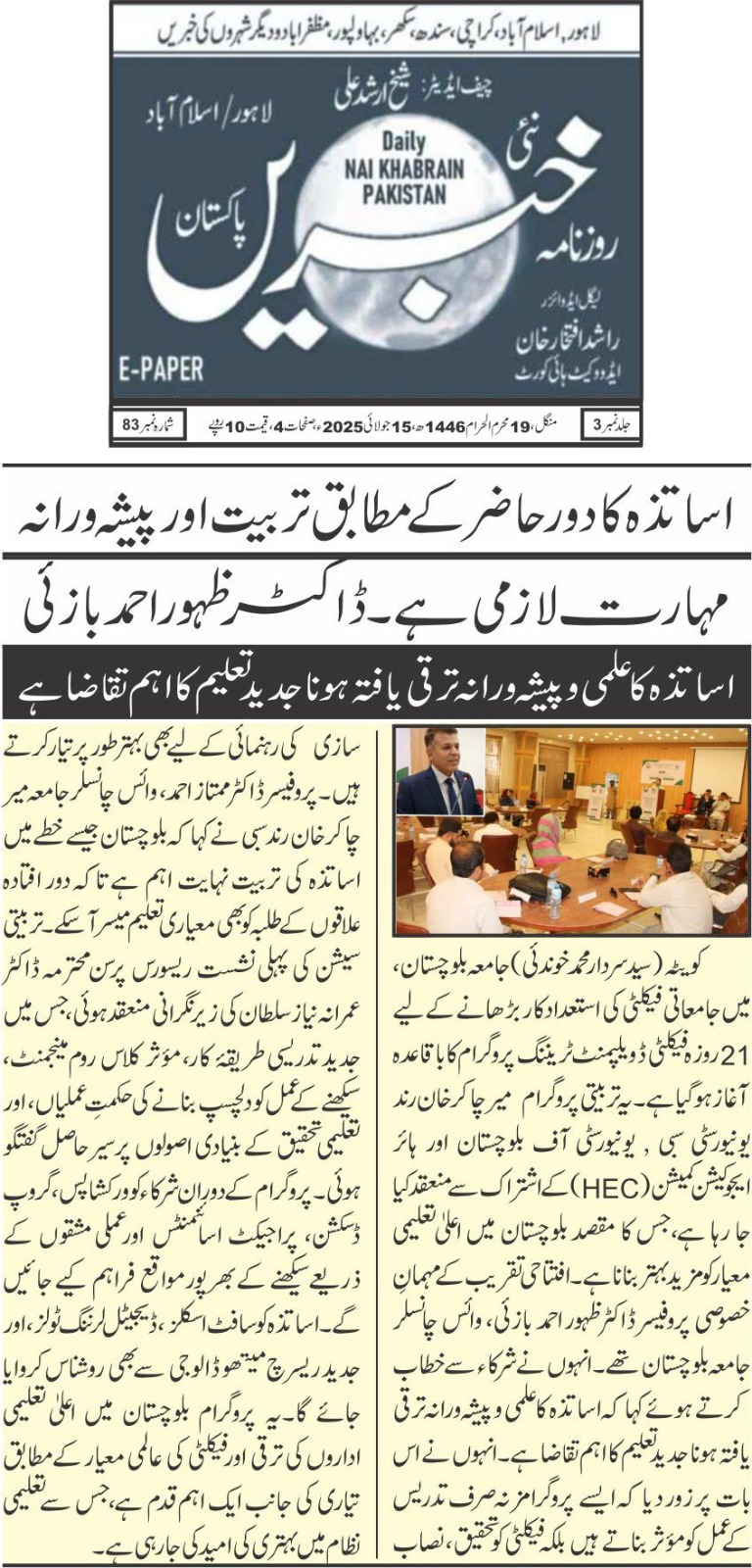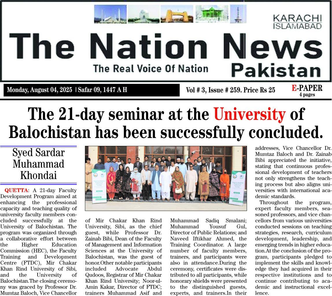 The 21-day Faculty Development Program organized at the University of Balochistan to improve the professional skills and teaching quality of teachers was successfully completed. Department of Public Relations, DPR University of Balochistan 2 Aug 2025