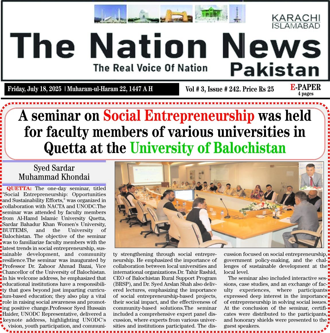 A one-day seminar titled “Social Entrepreneurship: Opportunities and Efforts for Sustainability” was organized at the University of Balochistan, in collaboration with NACTA and (UNODC). The seminar was well attended by faculty members from Al-Hamad Islamic University Quetta, Sardar Bahadur Khan Women University, BUTEMS, and University of Balochistan. 15 July 2025, DPR, University of Balochistan