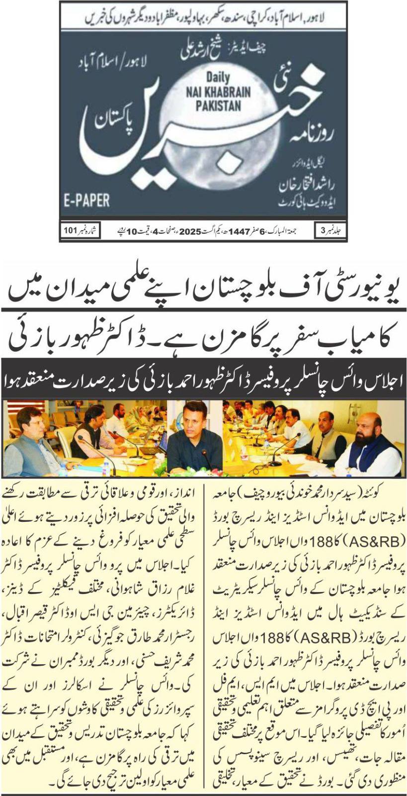 The 188th meeting of the Advanced Studies and Research Board (AS&RB) was held at the University of Balochistan under the chairmanship of Vice Chancellor Prof. Dr. Zahoor Ahmed Bazai. Department of Public Relations, University of Balochistan 31 July 2025, Quetta