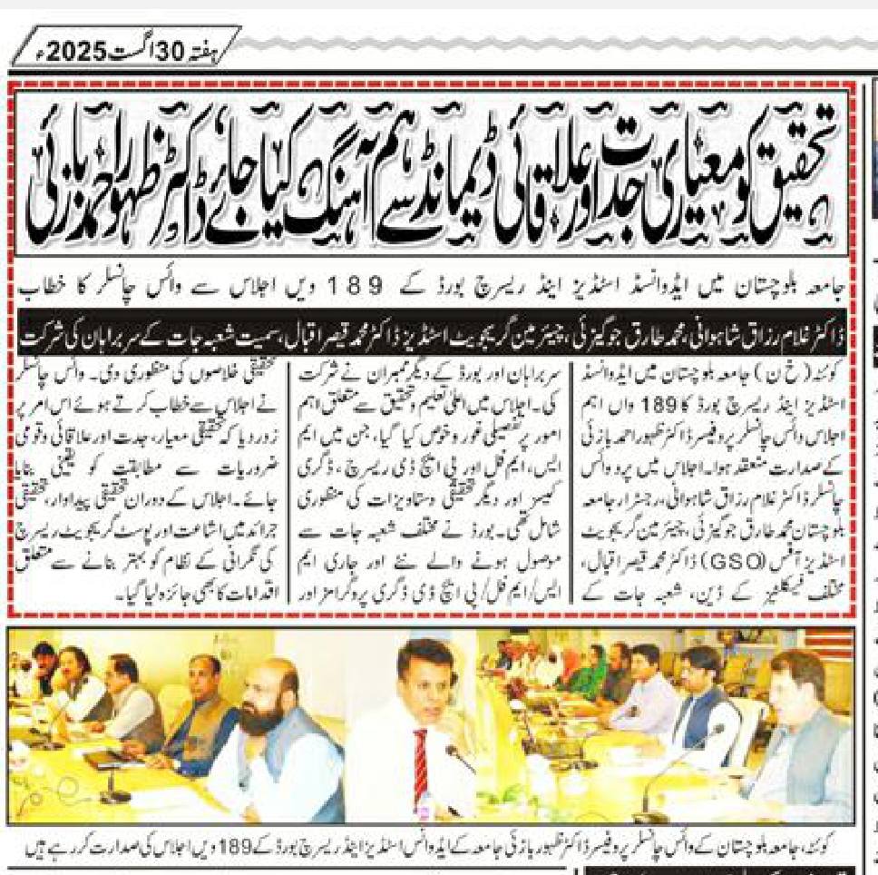 The 189th meeting of the Advanced Studies and Research Board (AS&RB) was held at the University of Balochistan under the chairmanship of Vice Chancellor Prof. Dr. Zahoor Ahmed Bazai Department of Public Relations University of Balochistan August 28, 2025