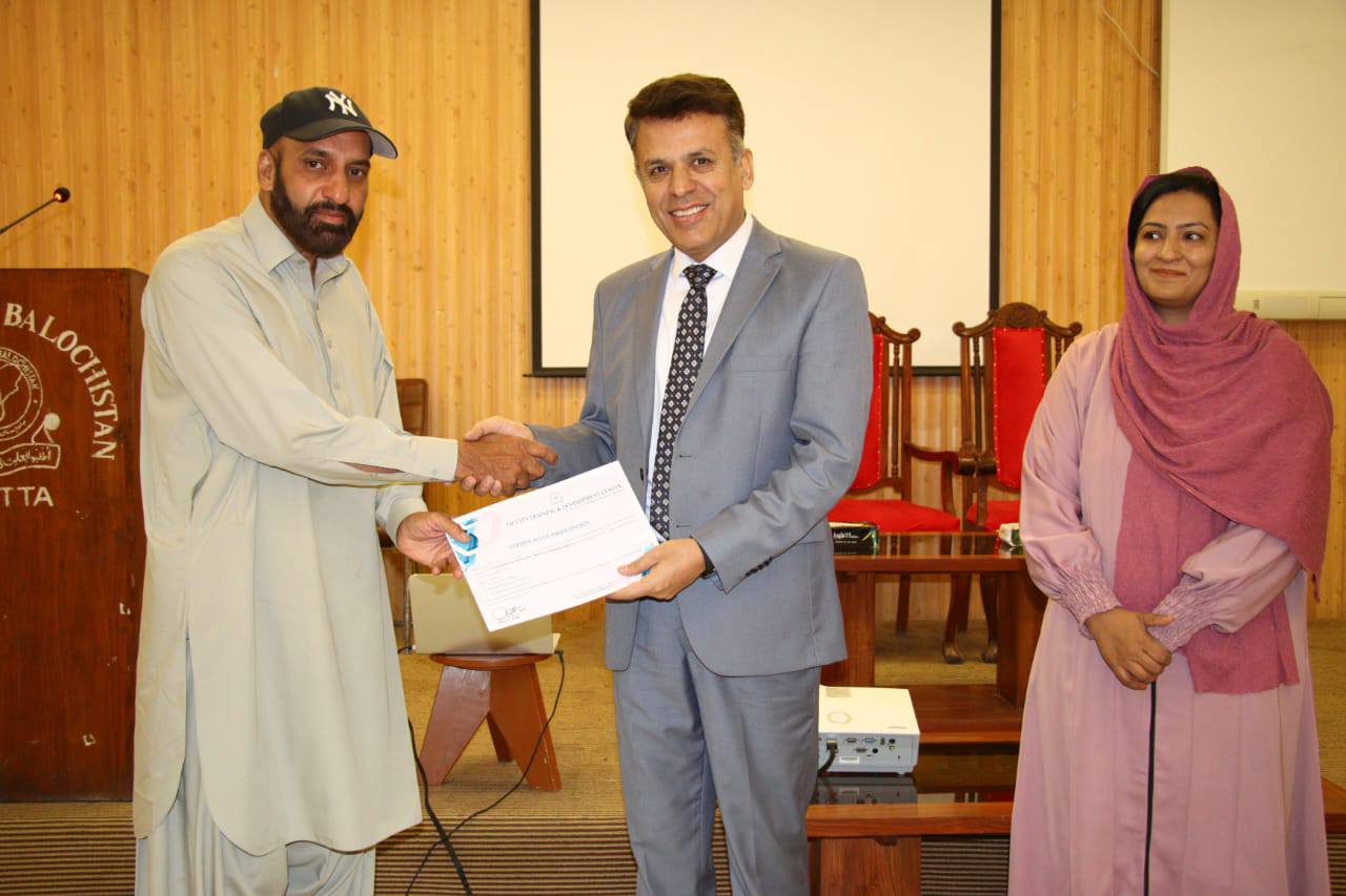 University of Balochistan Vice Chancellor Prof. Dr. Zahoor Ahmed Bazai awarded a shield of appreciation to Aamir Khan, a student of the university, for his outstanding achievement in mountaineering. University of Balochistan, Department of Public Relations (DPR), June 4, 2025