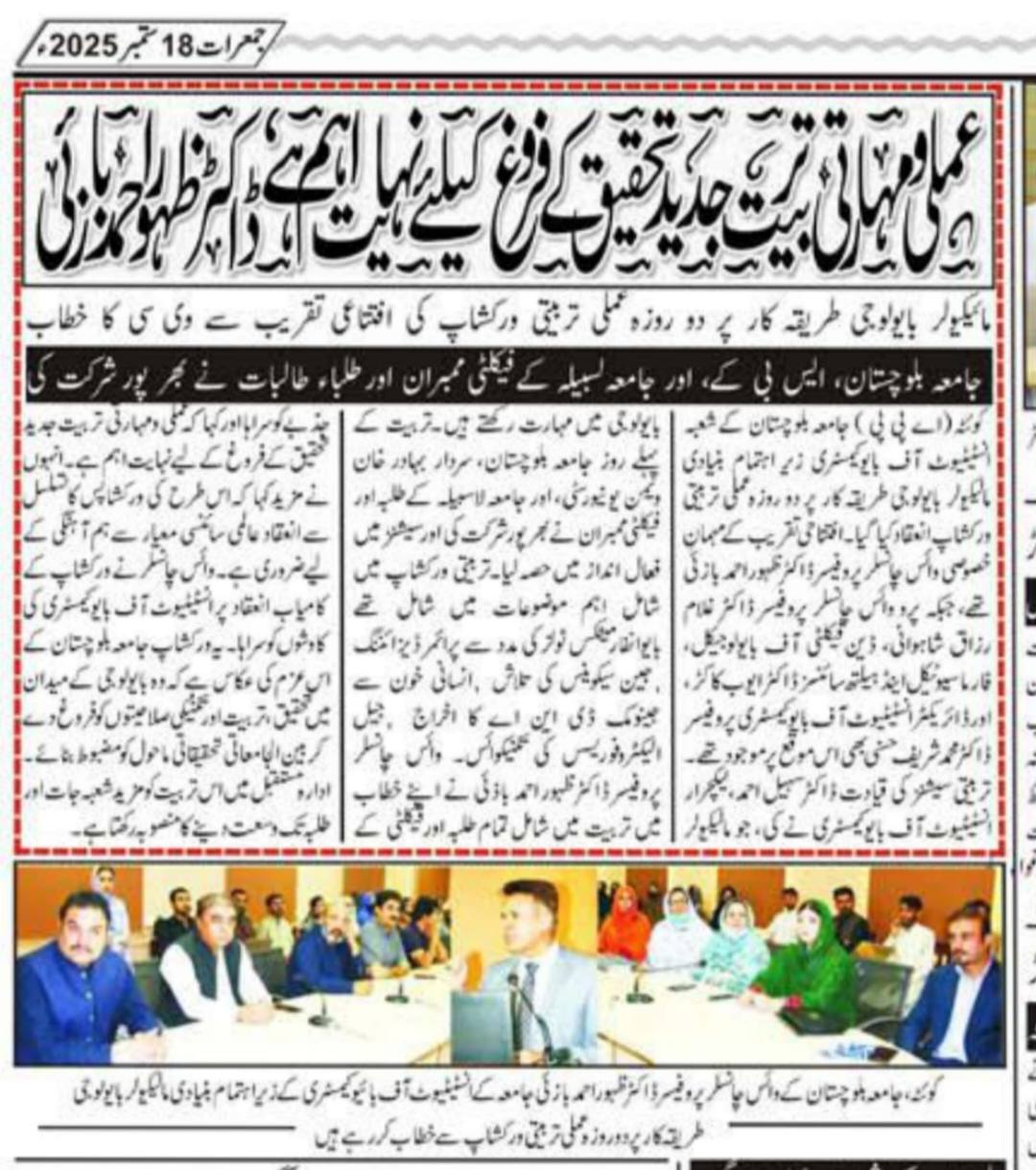 A two-day practical training workshop on basic molecular biology methods was organized at the University of Balochistan. Public Relations Department, DPR University of Balochistan 17 September 2025