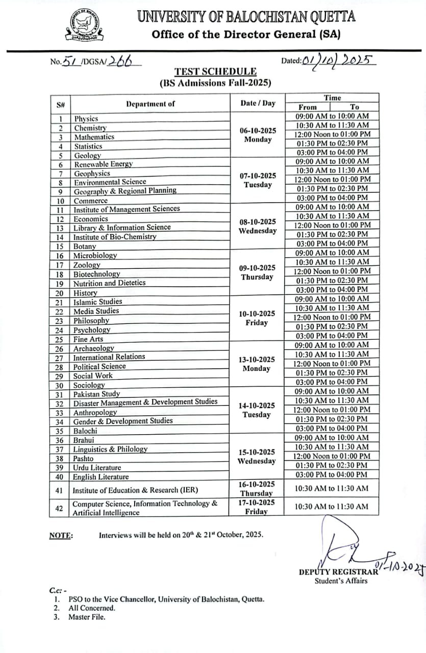 University of Balochistan releases entrance test schedule for Fall 2025 BS program