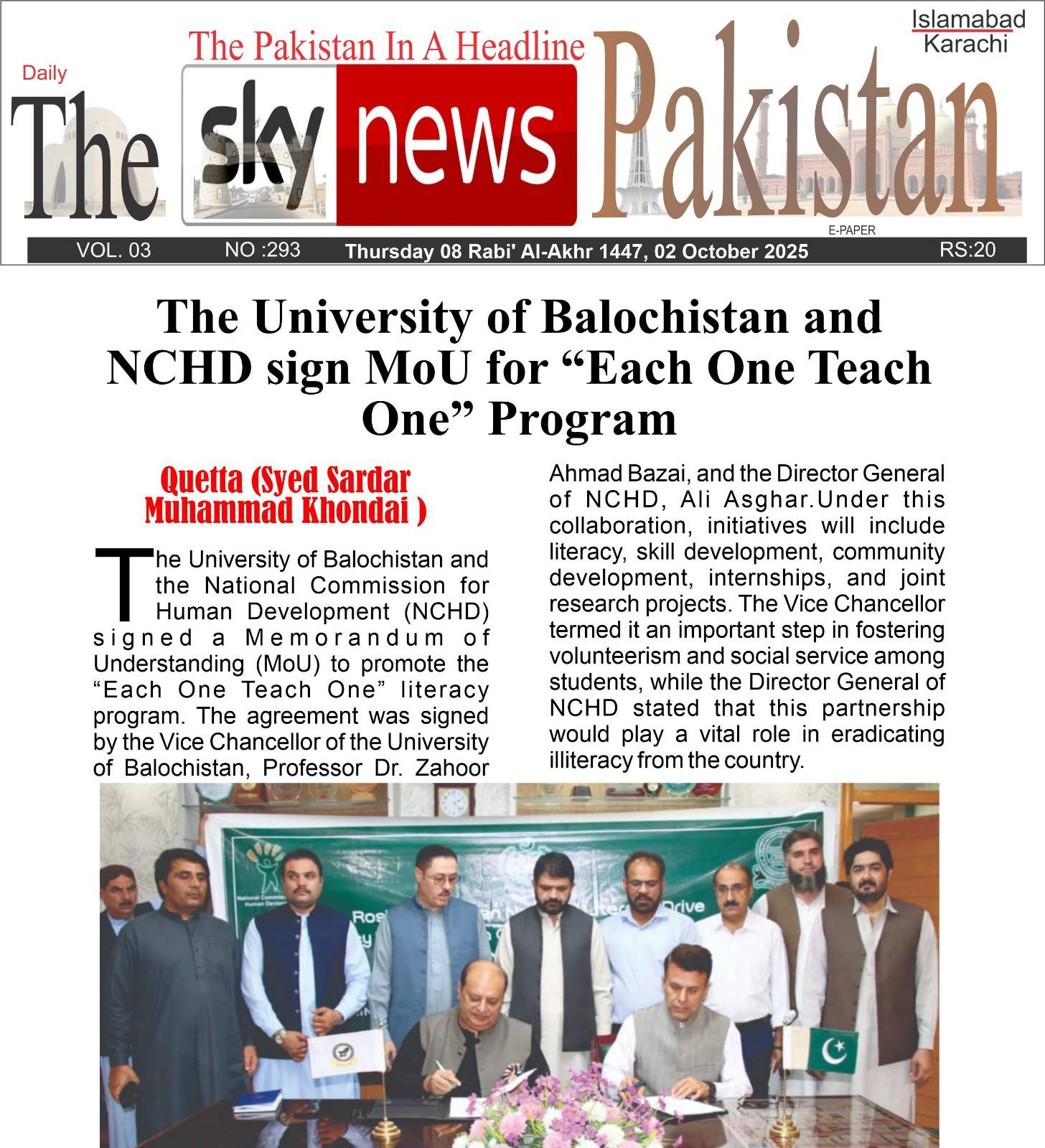 Memorandum of Understanding signed between University of Balochistan and NCHD for ‘H1 Teach1’ program Department of Public Relations, University of Balochistan October 1, 2025