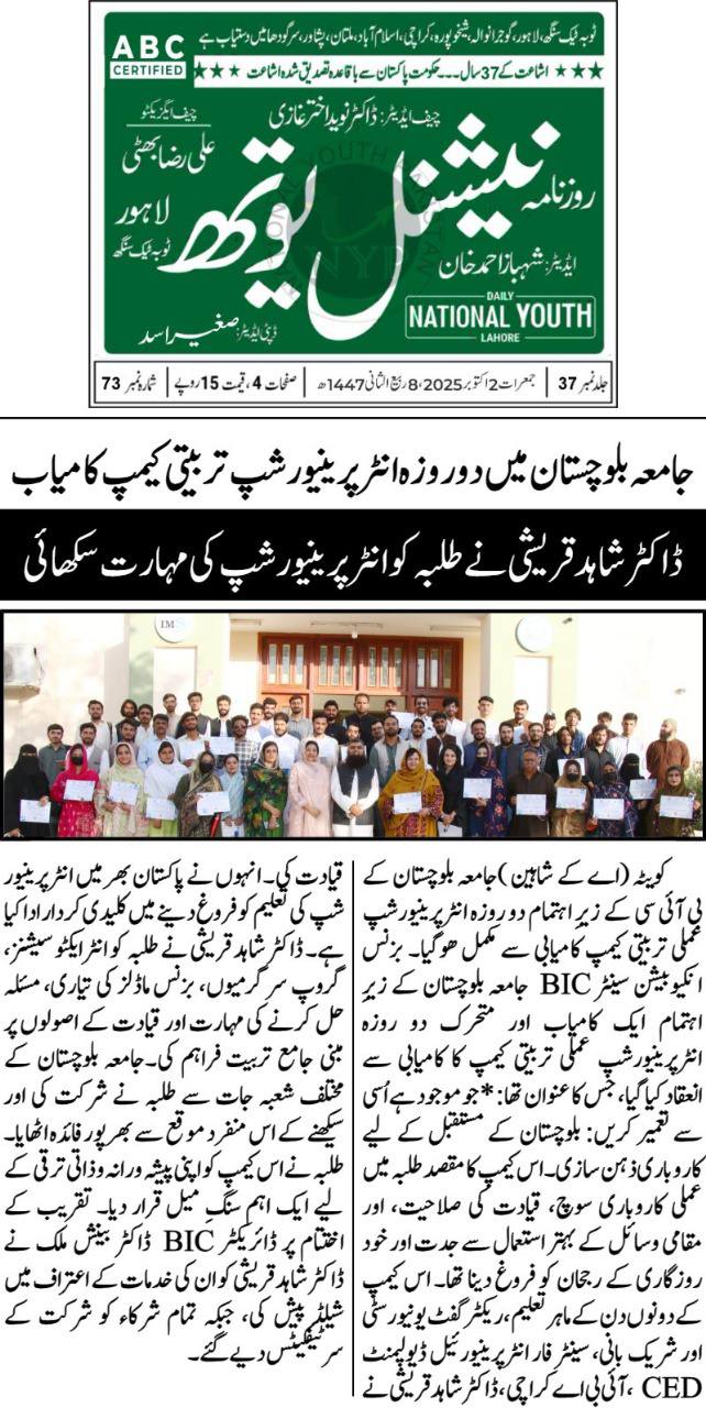 A two-day Entrepreneurship Practical Training Camp was organized by BIC of the University of Balochistan. Department of Public Relations, DPR University of Balochistan 29 September 2025