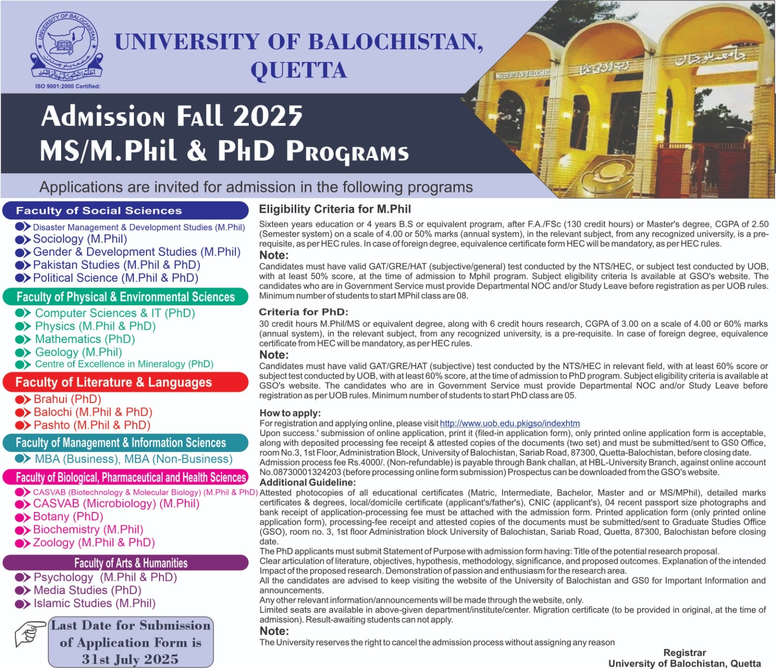 Admissions are Open at university of Balochistan Fall 2025 BS 4 years & 5 years programs