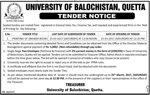 The Institute of Biochemistry, UoB, Quetta would like to invite tenders