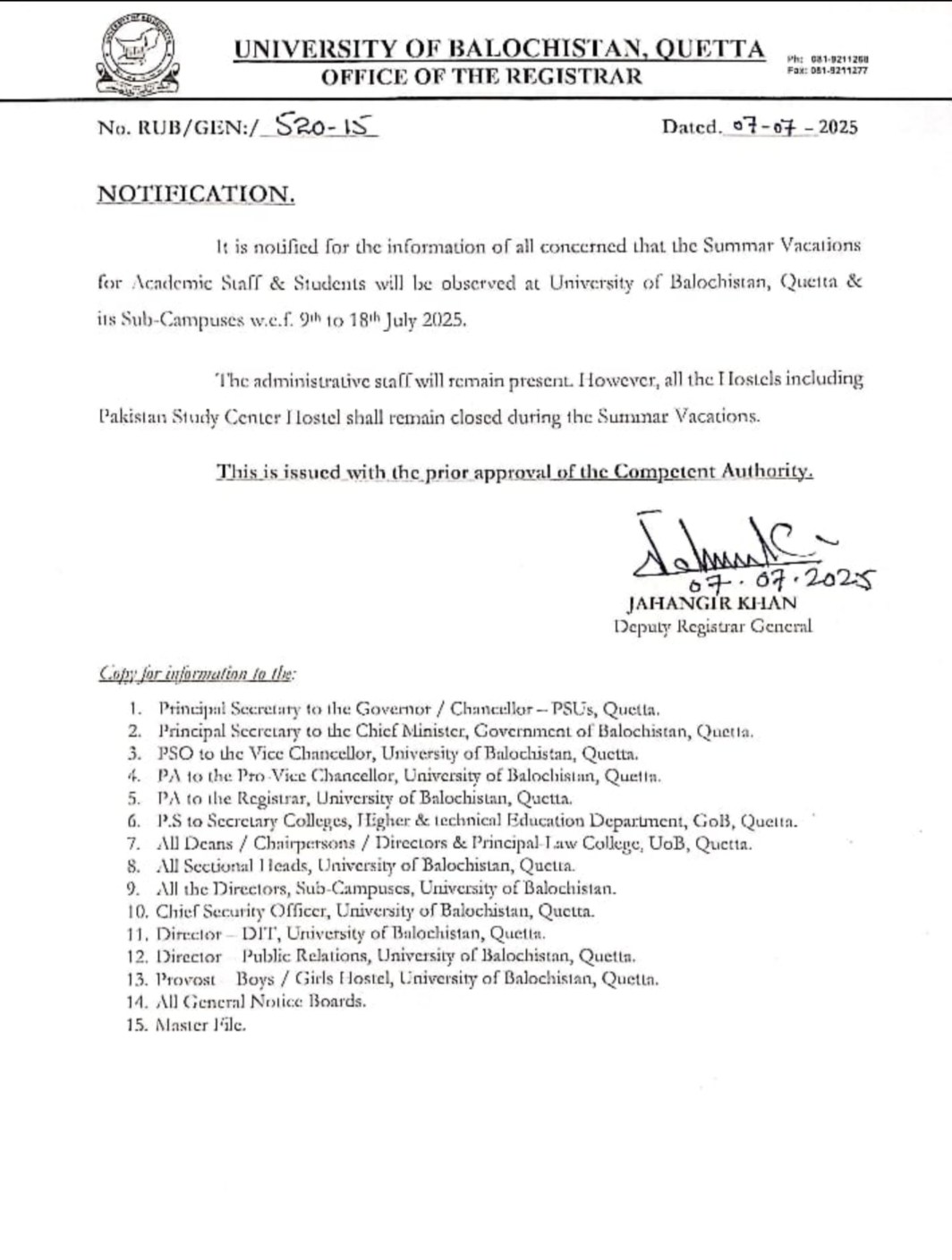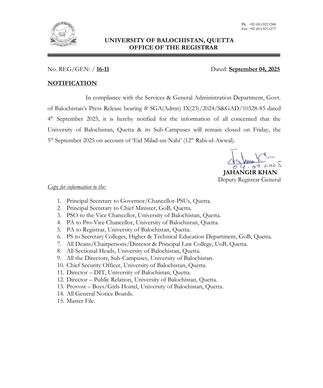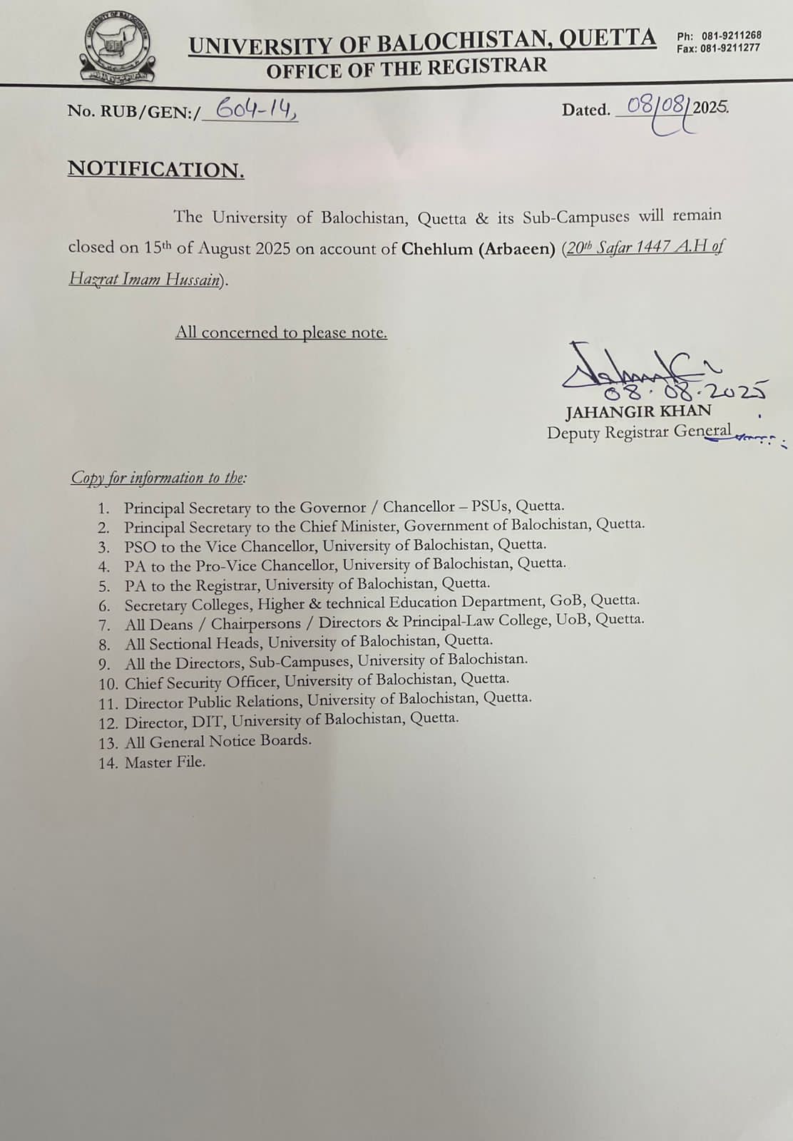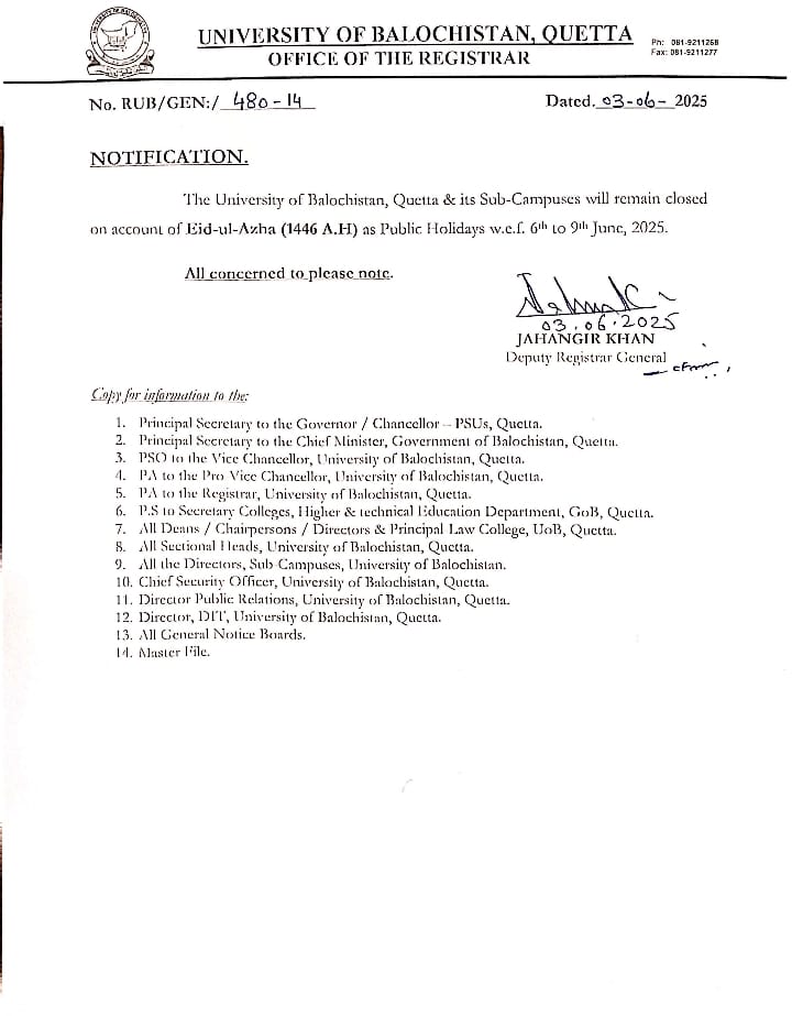 University of Balochistan Quetta & its Sub-Campuses will remain closed on account of