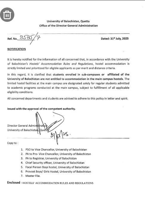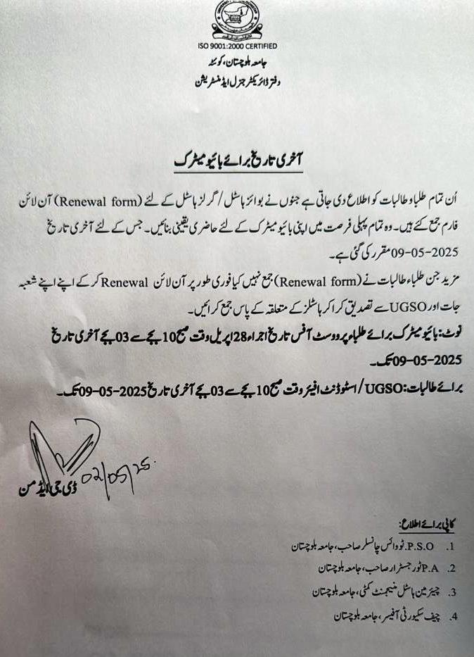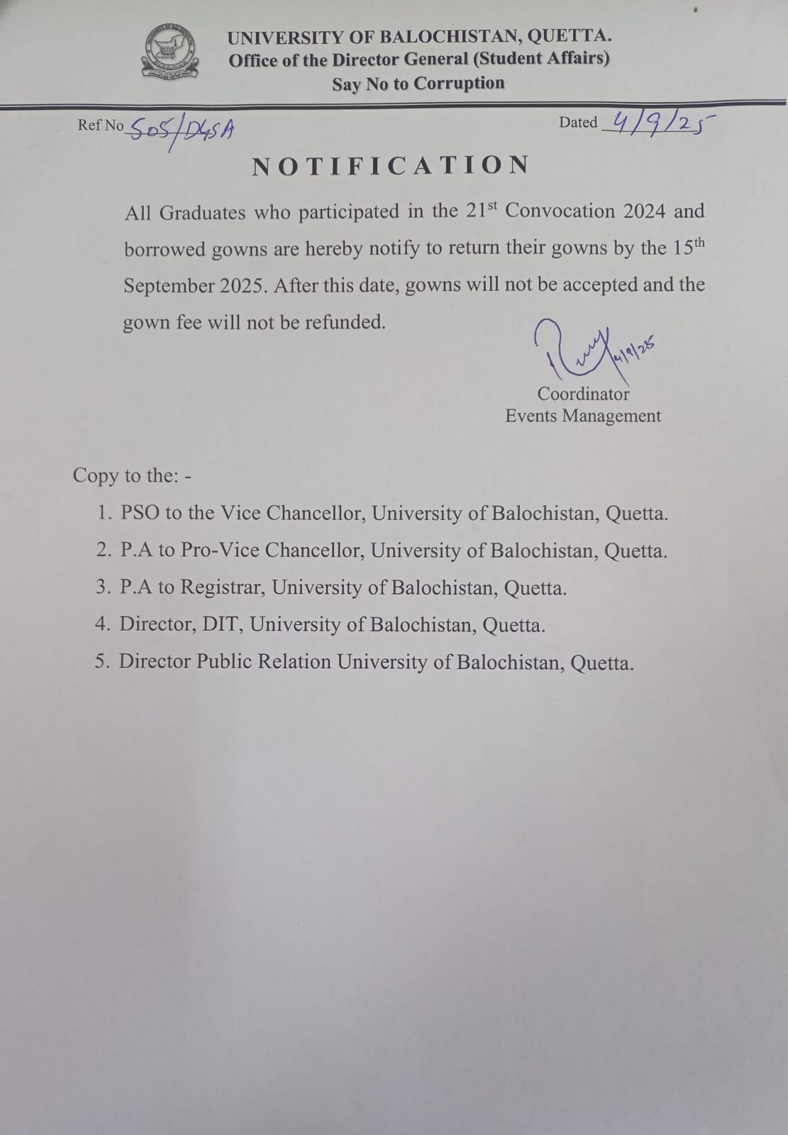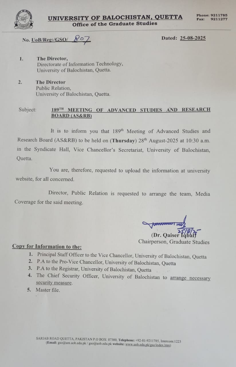University of Balochistan Quetta & its Sub-Campuses will remain closed on account of