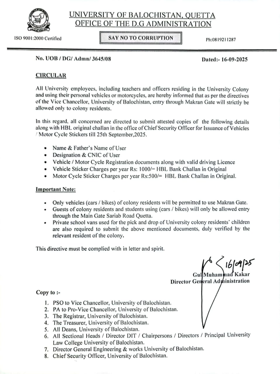 Entry Policy and Sticker Issuance for University Colony Residents at Makran Gate |
