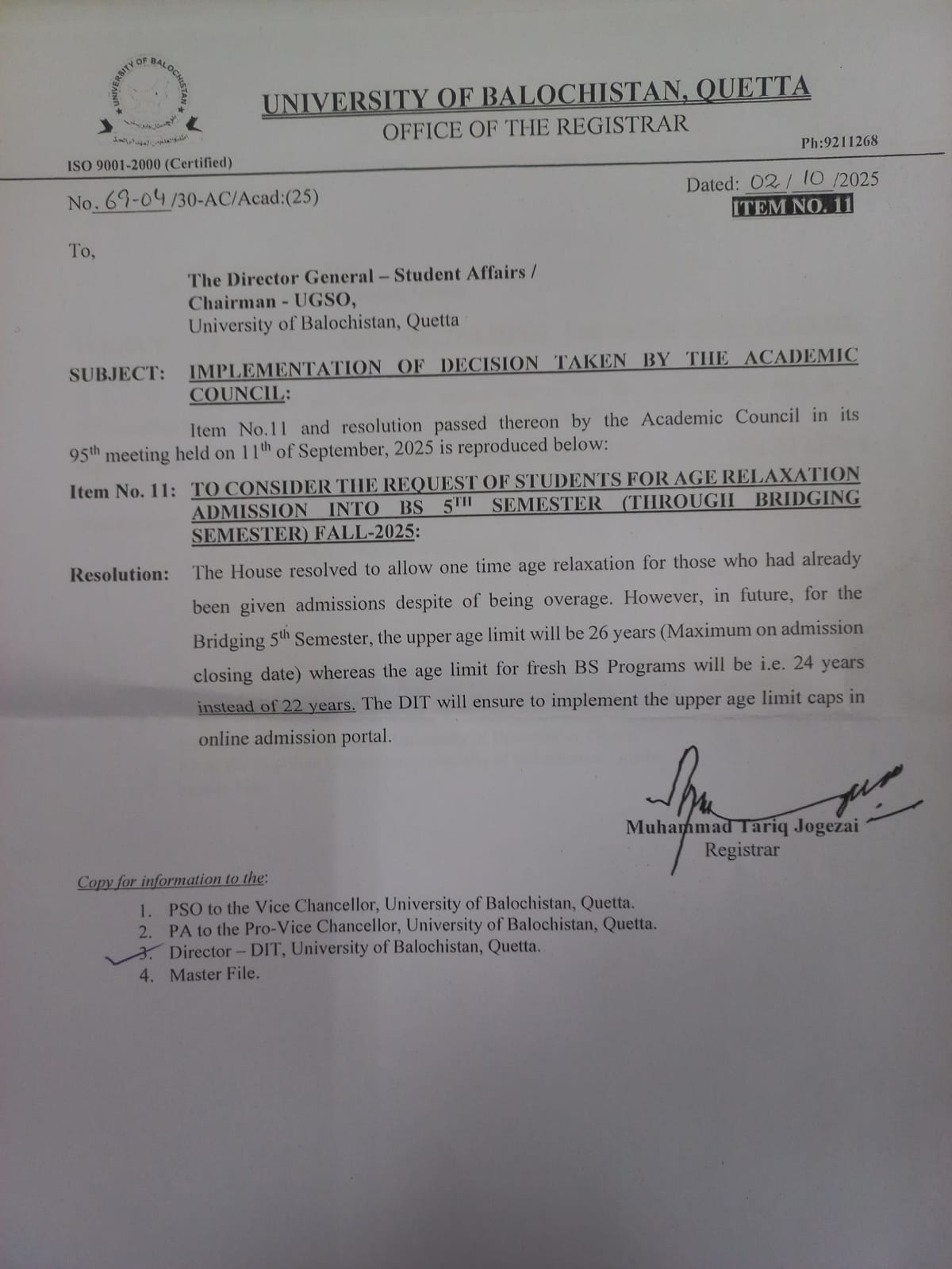 Implementation of Revised Age Limit Policy for BS and Bridging Semester